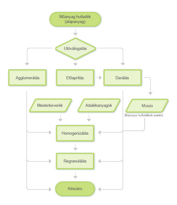 A műanyag hasznosítás második fázisa az előkészítő üzemben létrehozott félkész anyagok granulálásra való előkészítése,mely a mindenkori másodnyersanyag megrendelői igényekhez igazodik. A megfelelő minőségű, újrahasznosított műanyag regranulátum előállításához, az üzemben használatos receptúrák szerint, mesterkeverék illetve vevői igény esetén egyéb adalékanyagok felhasználásával történik a homogenizálás. Ennek elsődleges célja, hogy a legyártandó regranulátum azonos fizikai tulajdonságokkal rendelkezzen, amely a későbbi késztermék gyártás szempontjából elsődleges fontosságú.